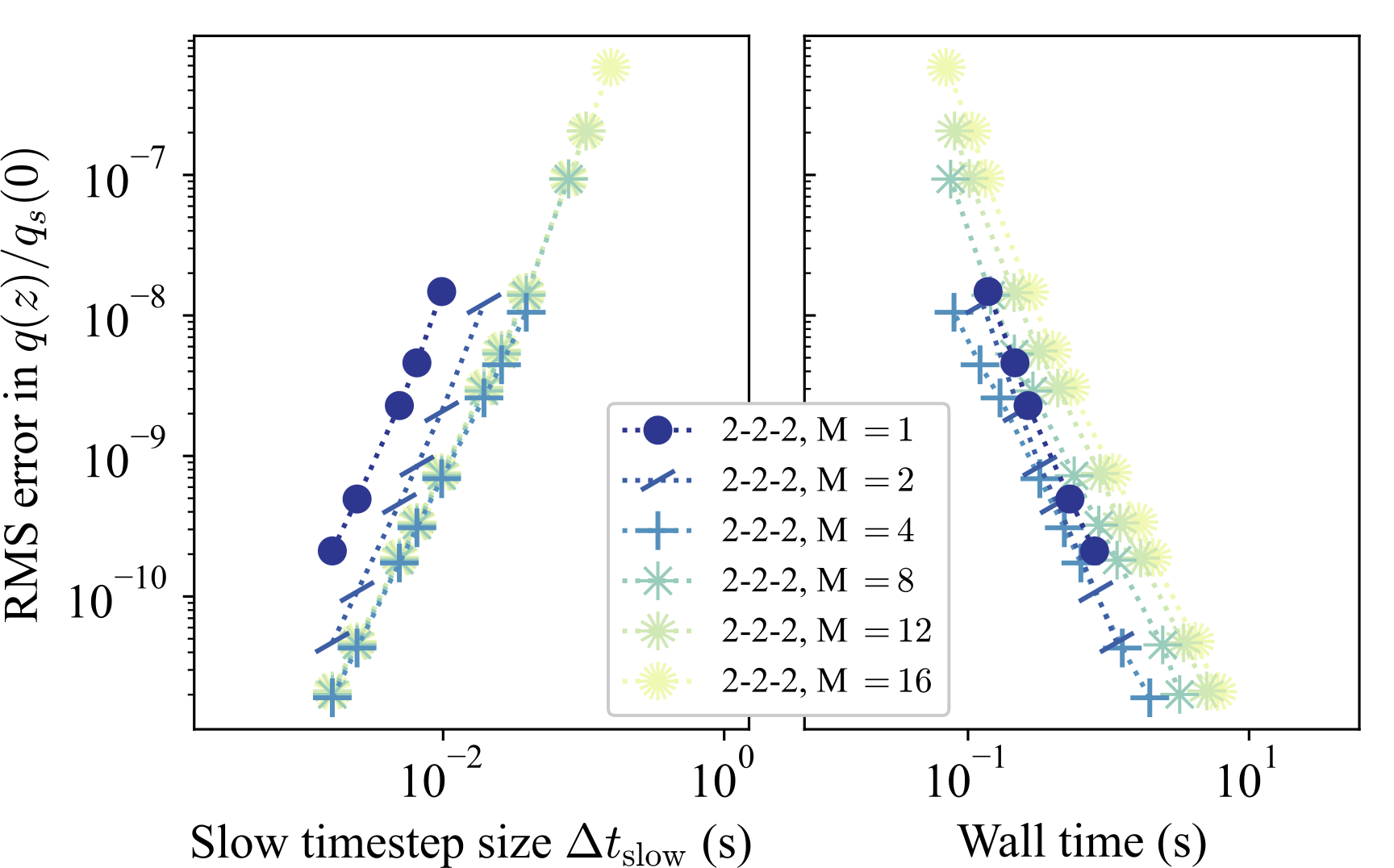 In 2024 I had the opportunity to work in the Center for Applied Scientific Computing at Lawrence Livermore National Laboratory for 3 months. I investigated temporal operator splitting methods, such as those used to couple the different physical processes included in the E3SM atmosphere model. I presented results from this work at AGU24; an abstract can be found here. I am currently interested in comparing the performance of different types of operator splittings (multirate, IMEX, etc.) and their suitability for timestepping geophysical systems (e.g., moist convection, aerosol models, etc.) when there are large separations in time scales.