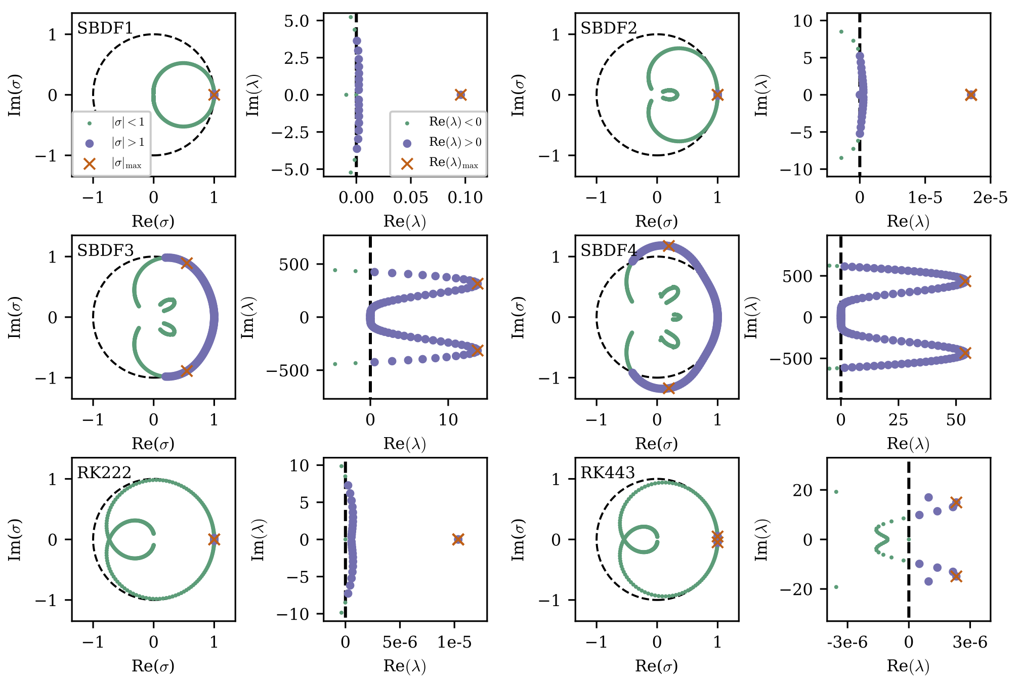 I use the pseudospectral code Dedalus which employs multistep and multistage implicit-explicit (IMEX) timestepping schemes to discretize problems in time. The stability properties of these schemes are well understood in the context of linear theory, but there remain open questions when evolving nonlinear flows. Recently, I have used methods from multiscale asymptotics to develop an analytical framework to determine the stability of IMEX schemes when used to evolve nonlinear waves. A published manuscript on this work is published in the Journal of Computational Physics here, and can otherwise be found on the arxiv here. This analysis has so far been successfully applied to dispersive problems (e.g., soliton propagation), but future work can look to extend this analysis to problems with dissipation and to other classes of timestepping schemes.